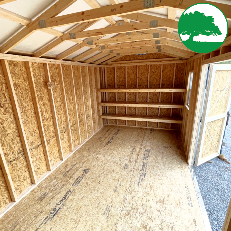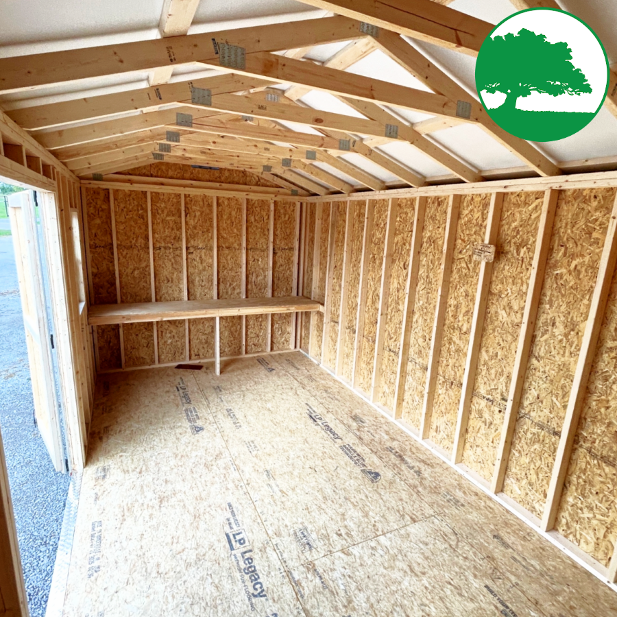 Features: Double Entry Doors, 8′ TALL Walls, (2) 2′ x 3′ Aluminum Windows, 3-Tier OSB Shelving (16″ deep), Plywood Workbench (24″ deep), LP SmartSide Siding (50 Year Warranty)