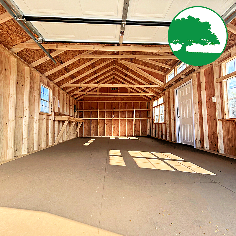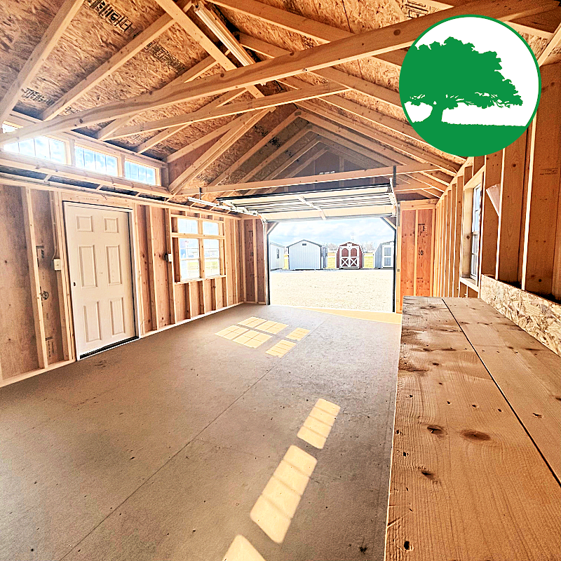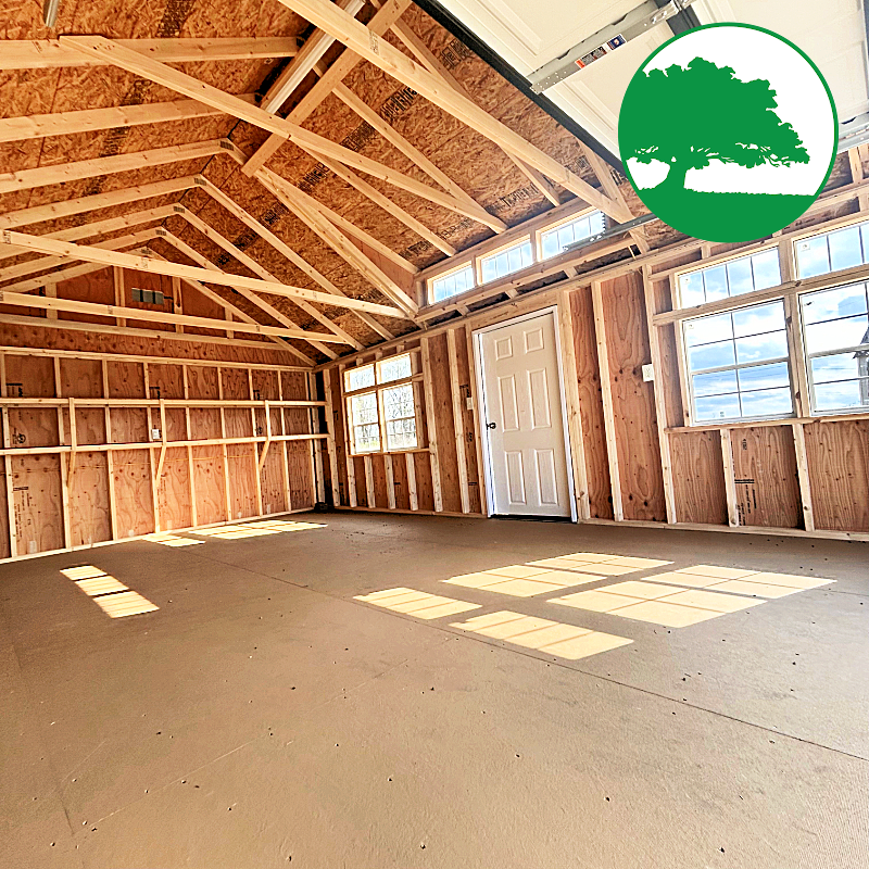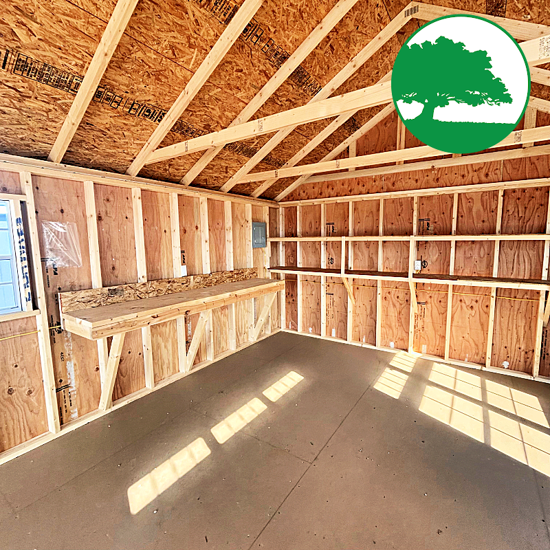 Additional Features: Generous Roof Overhangs, 6’6″ Sidewall Height, Standard Electric Package (Box, (3) Outlets, Switch, 4′ Shop Light), Pre-hung 6-Panel Fiberglass Entry Door, 9′ Overhead Door (Black), (5) 24″ x 30″ Aluminum Windows w/ Shutters, (4) Transom Windows, 8′ Shed Dormer w/ Transoms, 14′ Double Shelf, 8′ Heavy Duty Workbench, 2″ x 4″ Floor Joists (8″ o.c.), Wall Studs (16″ o.c.), Rafters (24″ o.c.), DuraTemp Plywood Siding (50 Year Warranty), LP ProStruct Coated Flooring, 1/2″ OSB Roof Sheeting, Dimensional Shingles (30 Year Warranty) & FREE Delivery with blocks within 50 miles.