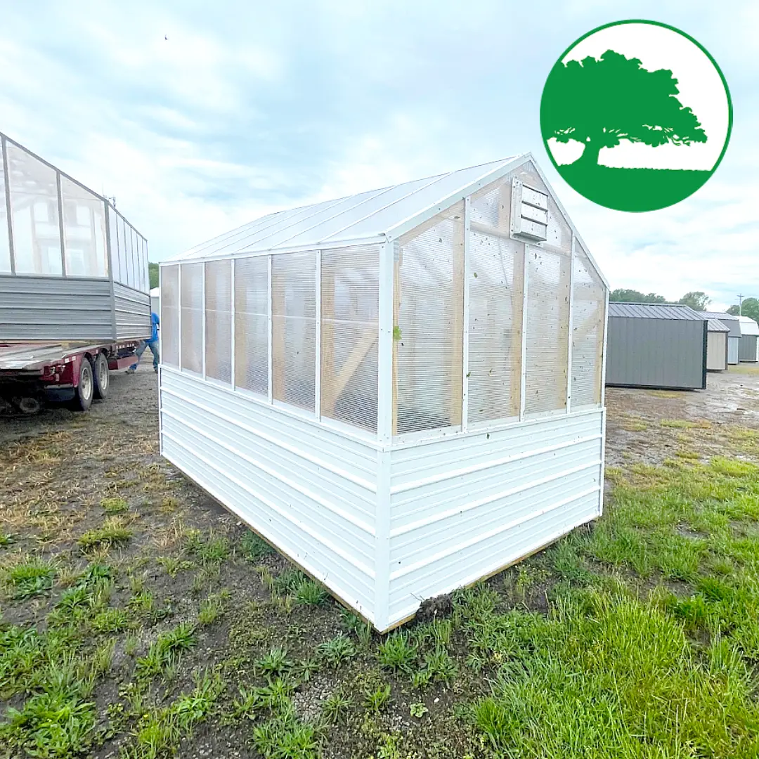 Features: Storm Door Upgrade, 8 mm Twin-Wall Polycarbonate, Worry Free Thermostat Controlled Exhaust Fan / Electric, Heat Activated Intake Vent, 2′ Plastic Gardening Bench, (2) Ground Anchors Included