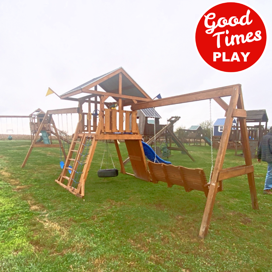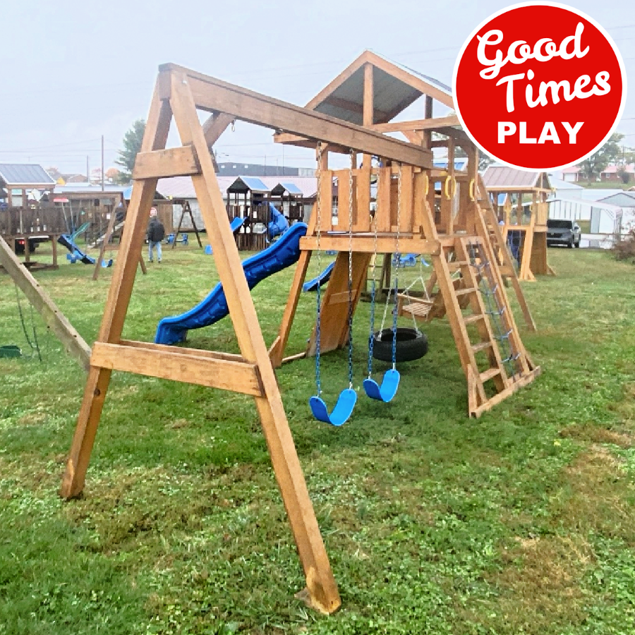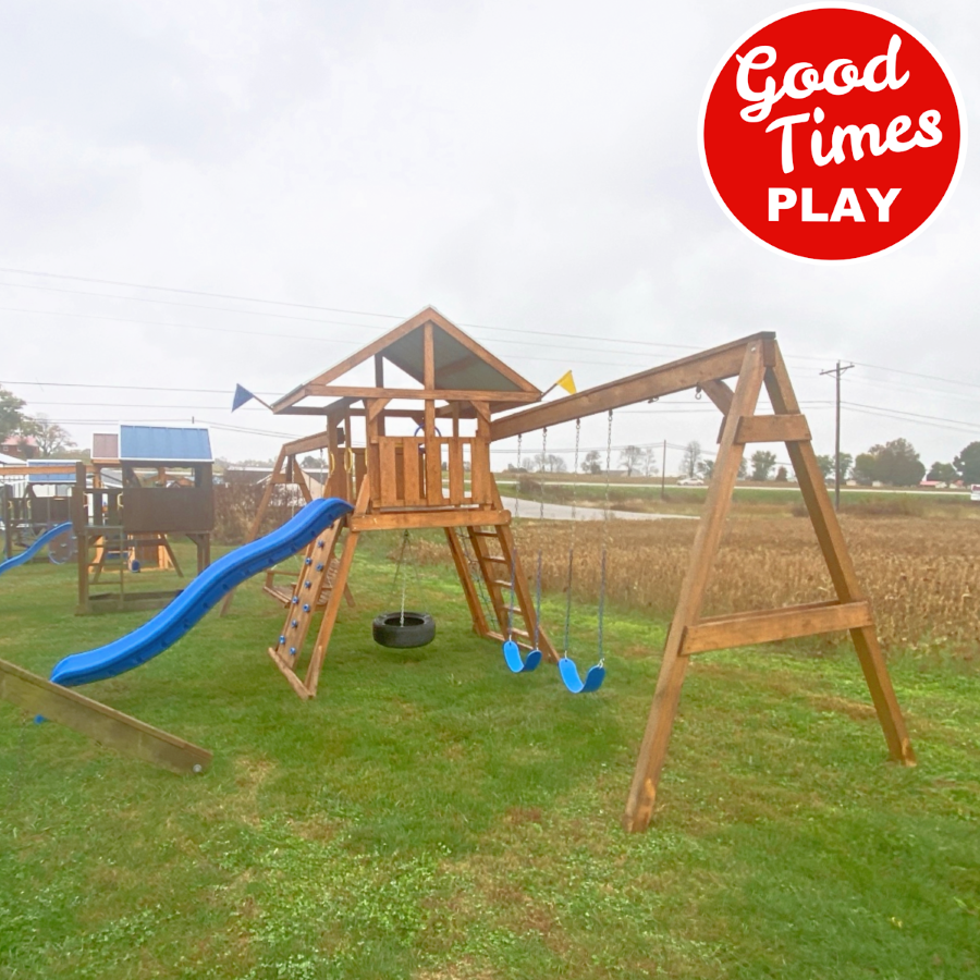beams / accessories: 3 position swing beam with (3) belt swings, additional swing beam with 5ft adult swing