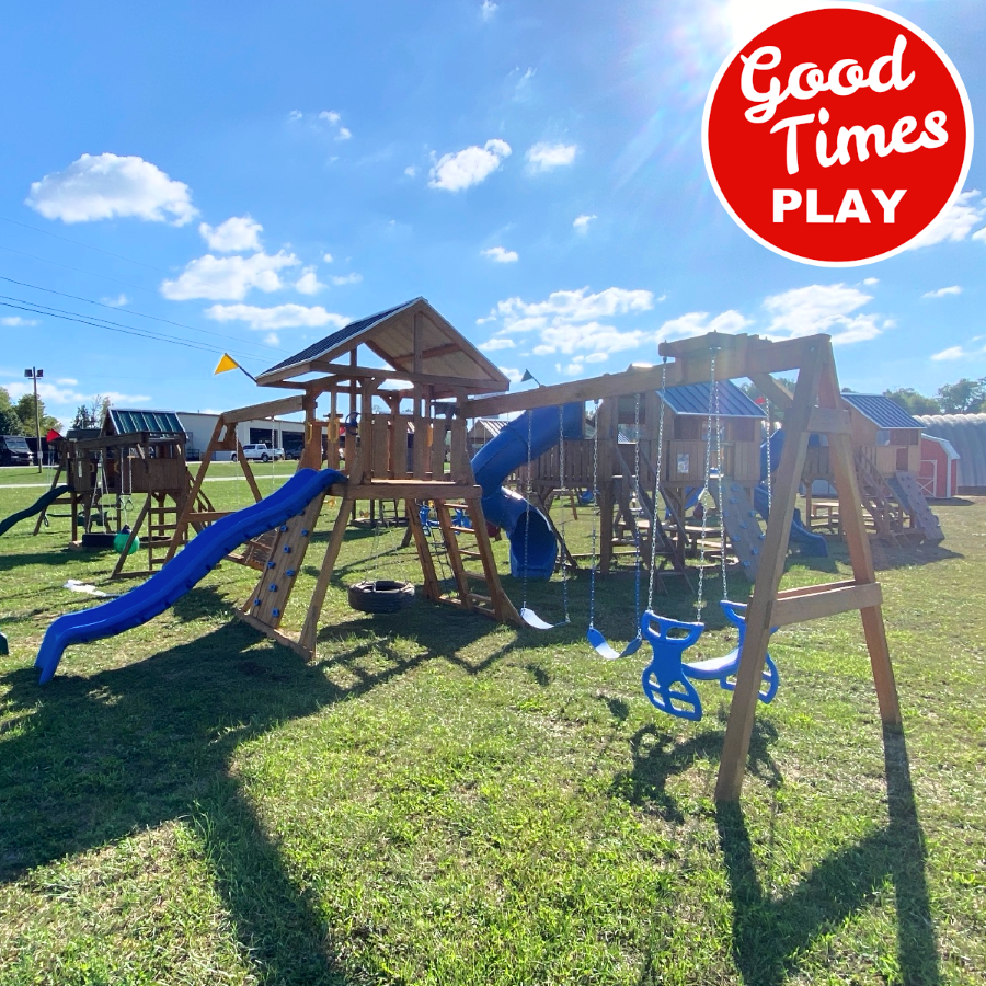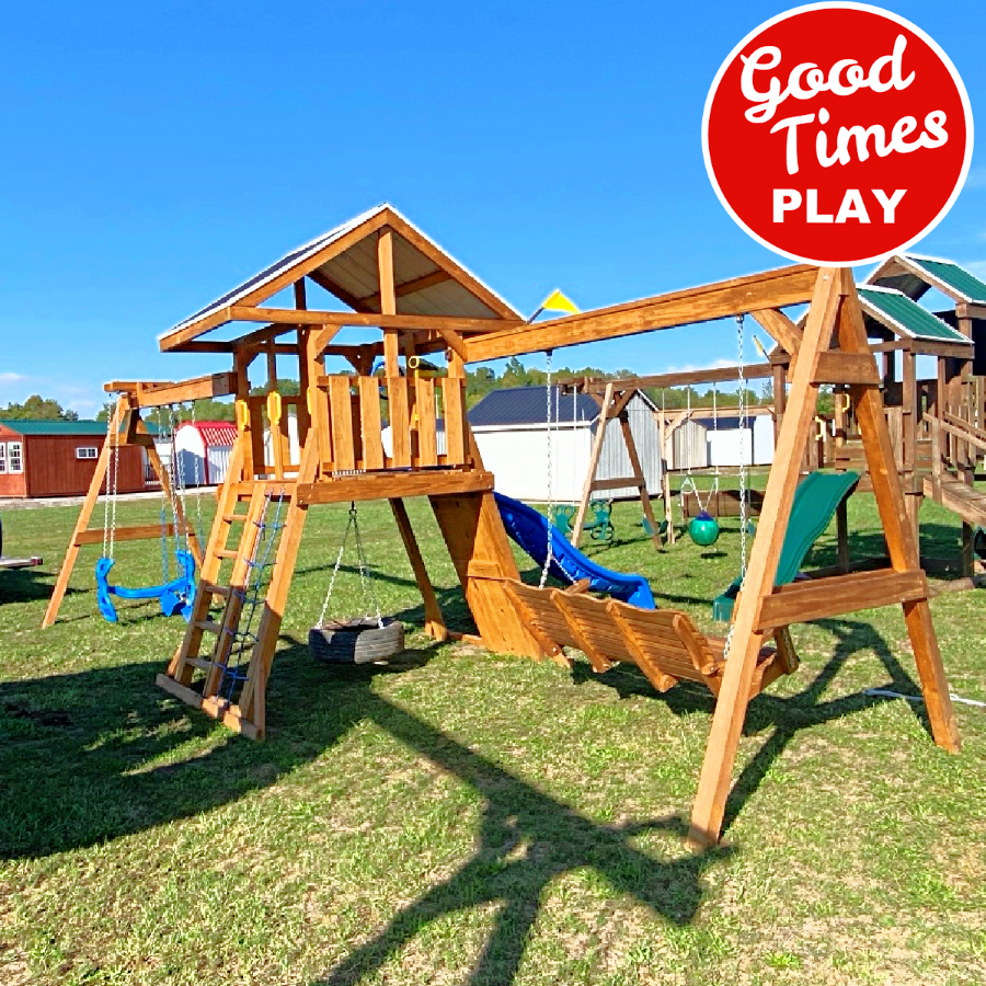 beams / accessories: 3 position swing beam with (2) belt swings & ez ryder (2-kid swing), additional swing beam with 5ft adult swing