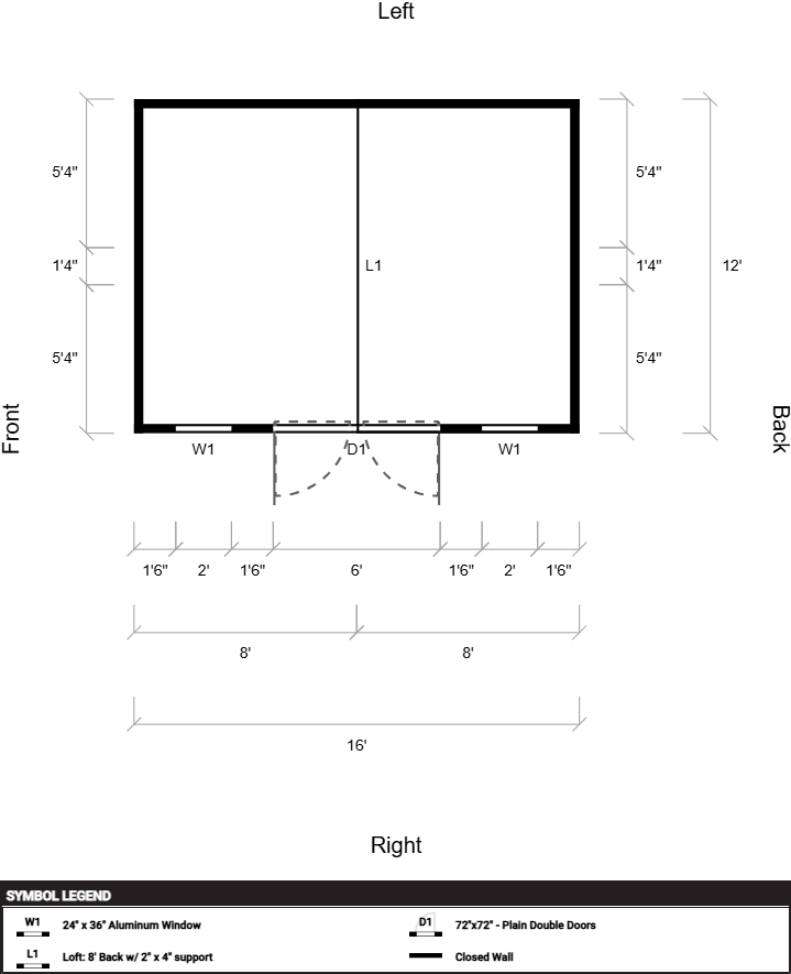 Features: Double Entry Doors, (2) 24″ x 36″ Aluminum Windows, Double Overhead Loft, LP SmartSide Siding (50 Year Warranty)